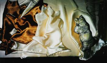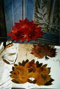 Installation objets 70/ « Eventails de la reine rouge et de la reine blanche » végétaux , laiton, papiers 71/ « Miroir pubis » « Sceptre » « Couronnes » satin et laiton 72/ « Gants chat reine» satin et dessin pastels gras. |
